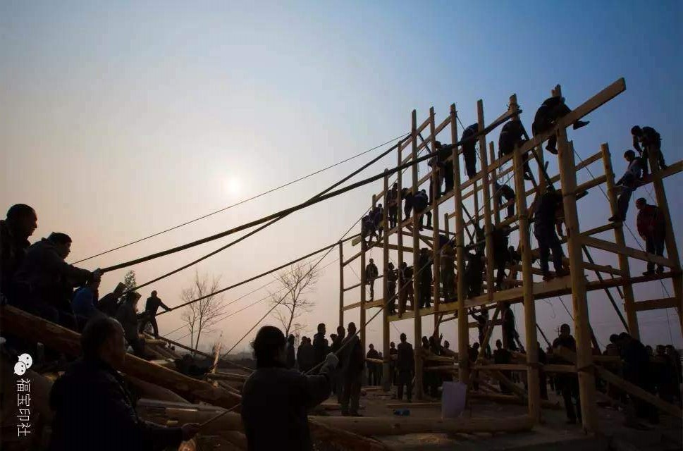 摄影:齐心合力建新房2014年1月22日芦山县龙门乡灾后重建白伙新村聚居点工地,一百多名村民帮一户村民建新房扯排立 谢应辉