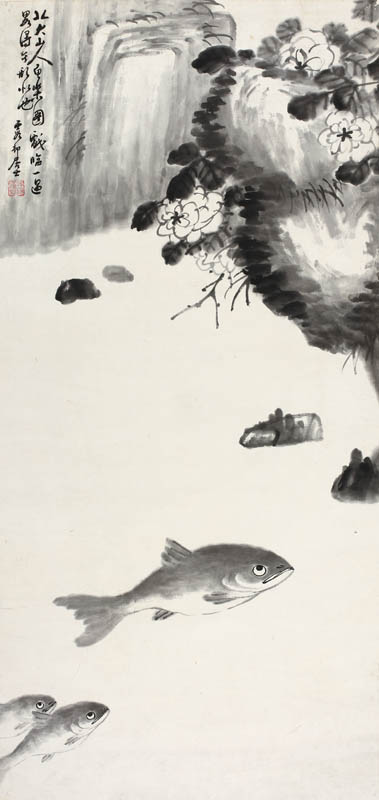 款识:八大山人鱼乐图戏临一遍,略得其形似也。霞村居士。