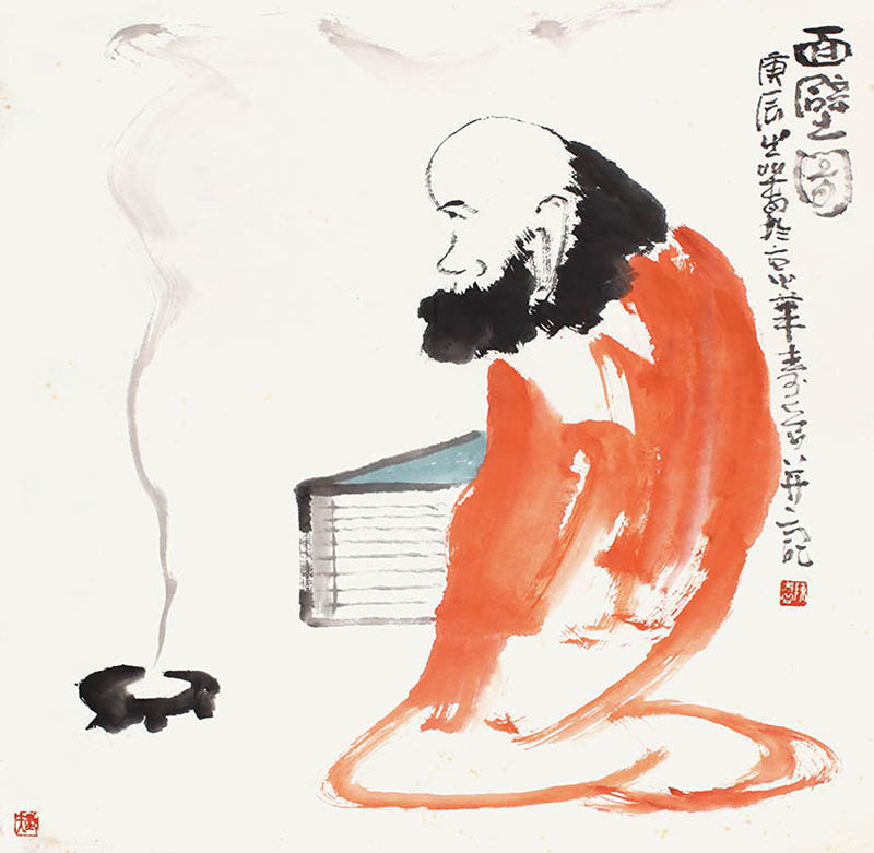 款识:面壁图。庚辰之春于京华,寿岳并记。