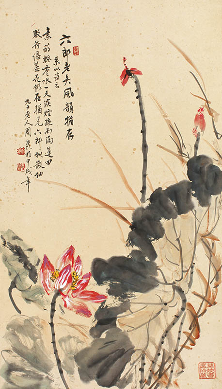 款识:六郎老矣,风韵犹存。系以诗云:素葩飘零水一天,淡烟疏雨满莲田。败荷偃盖花仍在,尤见六郎似散仙。九十老人周崑于甲戌年。