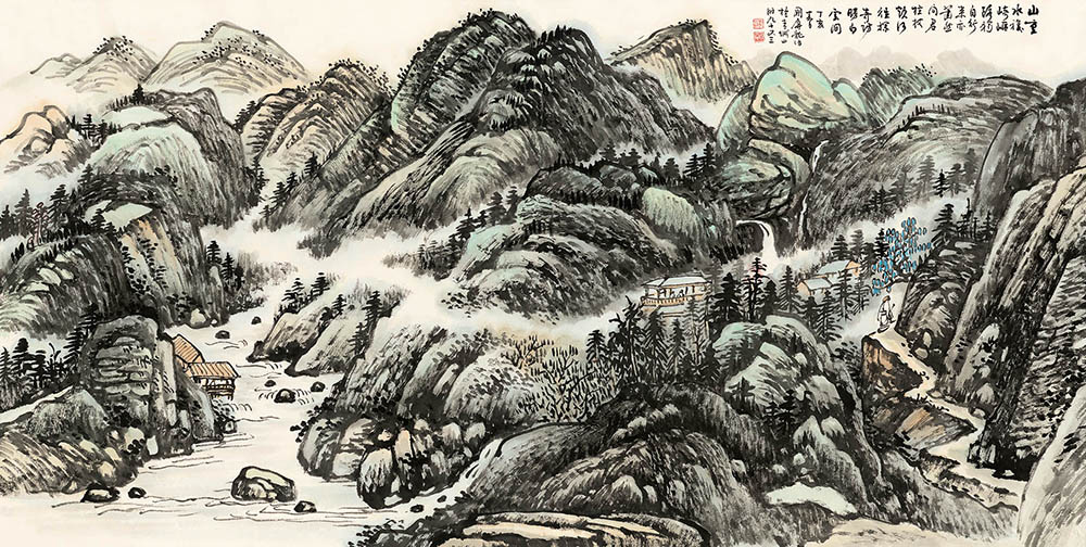 款识:山重水复崎岖路,独自行来亦萧然。问君拄杖欲何往,探奇访胜白云间。丁亥春日国屏龙治于青城山时九十又三。