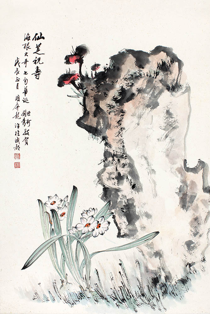 备注:龙老一生多画水仙,但水仙、灵芝、山石集于一画的作品甚为少见,估计当初乃是应人之请而为之,偶然间却独成佳构,令人倍加赞叹。