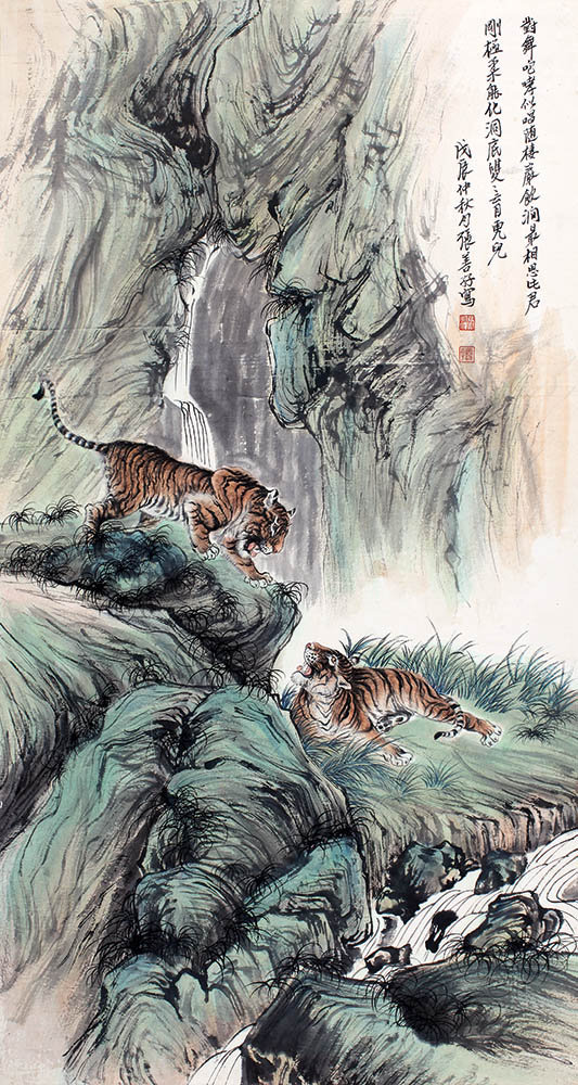 款识:对舞咆哮似唱随,栖岩饮涧最相思。此君刚极柔能化,洞底双双育虎儿。戊辰仲秋月,张善孖写。