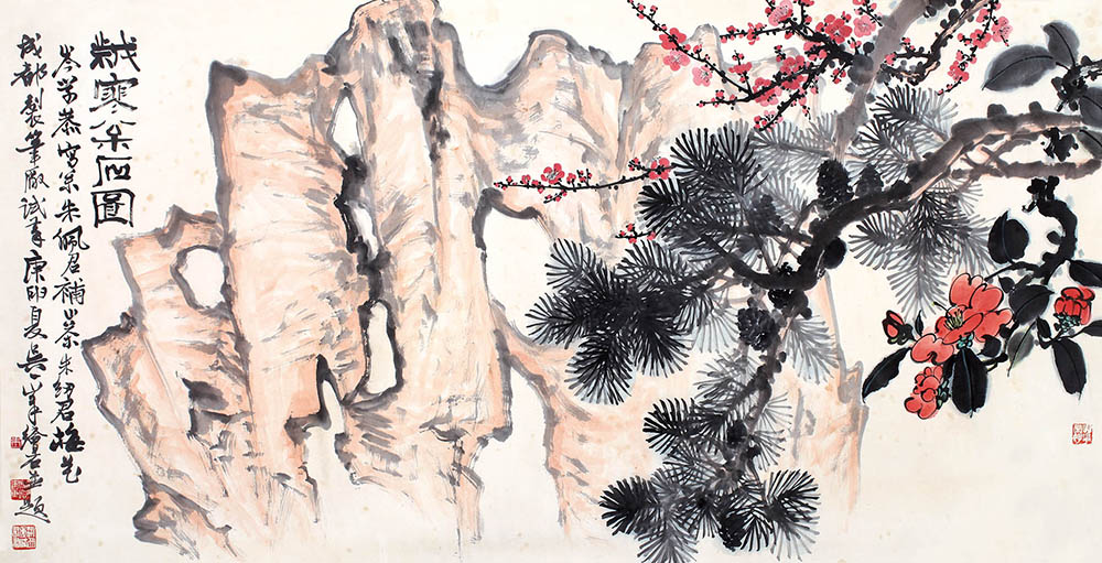 简介:岑学恭(1917-2009):满族,三峡画派创始人,中国美术家协会会员,国家一级美术师,四川省文史馆巴蜀诗书画研究会会长,四川省政协书画院副院长。以“岑三峡”之名响彻于世,为蜀中四老之一,现代巴蜀绘画史上之泰斗。吴一峰(1907-1998):浙江平湖人,名立,字一峰,别名士浚,自号大走客,别号吴窦圌,斋名“一峰草堂”。中国书法家协会会员、中国美术家协会会员。为蜀中四老之一,在现代巴蜀绘画史上享有崇高地位。朱佩君(1920-1995):女,四川省成都人。曾任成都画院院长、一级美术师,成都市美术家协会主席,四川省美术家协会副主席。中国美术家协会会员。作品有《芙蓉鲤鱼》、《菊花》、《山茶红艳樱花娇》等。朱纫君(1922-1994):别名朱兰, 女, 四川成都人。 擅长中国画。 先后在成都第三人民文化馆、重庆西南博物馆、四川医学院、成都二十三中、三 中、成都市二轻局蜀锦研究所、市工艺美术学校从事教学及设计。作品入选第一届、二届全 国美展、全国工艺美术展览。 作品有《山茶团扇》、《蜀绣挑绣花鸟画》等。 款识:岁寒松石图。岑学恭写松,朱佩君补山茶,朱纫君梅花,成都制笔厂试笔,庚申夏吴一峰绘石并题。