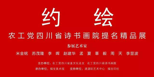 主办单位:农工党四川省直文化总支 农工党四川省诗书画院 承办单位:福宝美术馆 支持单位:清源际艺术中心 福宝印社 媒体支持:雅昌艺术网 中国美网 艺术圈网 99艺术网 四川书画艺术网 四川艺术网 《现代艺术》杂志 《言子关注》 《四川报道》杂志社 展览时间:2016年12月24日~29日 展览地点:福宝美术馆(成都市成华区崔家店路371号) 参展艺术家:米金铭 苏茂隆 李 晖 赵建华 孟 夏 辜 毅 周 天 李显波