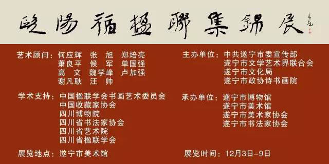 艺术顾问:何应辉 张旭 郑培亮 萧良平 候军 单国强 高文 魏学峰 卢加强 谢凡耿 汪帅 学术支持:中国楹联学会书画艺术委员会 中国收藏家协会 四川博物院 四川省书法家协会 四川省艺术院 四川省楹联学会 主办单位:中共遂宁市委宣传部 遂宁市文学艺术界联合会 遂宁市文化局 遂宁市政协诗书画院 承办单位:遂宁市博物馆 遂宁市美术馆 遂宁市美术家协会 遂宁市书法家协会 地 点:遂宁市美术馆 时 间:12月3日-9日