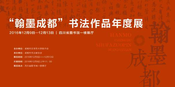 由成都市文联主办,成都市书法家协会承办的2016“翰墨成都”书法年度展及名家名作邀请展于12月9日(周五)上午十点在四川省图书馆(人民西路4号)举行开幕式,12月13日展览结束。