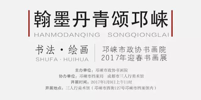 主办单位 邛崃市政协书画院 协办单位 邛崃市档案局 成都市三人行美术馆 开展时间 2017年1月9日上午11时 开展地点 三人行美术馆 (邛崃市西街127号邛崃市档案馆内)