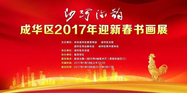主办单位:中共成华区委宣传部 成华区文联 成华区书法家协会 成华区美术家协会 承办单位:成华区文化馆 协办单位:福宝印社 展览地点:建设北路一段66号4楼美术厅 (原游乐园正门) 开幕时间:2017年1月18日上午10:00 展览时间:2017年1月18日至2017年2月17日
