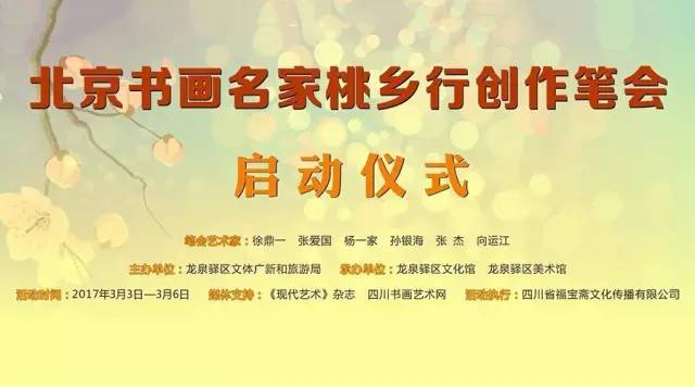 主办单位:龙泉驿区文体广新和旅游局 承办单位:龙泉驿区文化馆 龙泉驿区美术馆 活动执行:四川省福宝斋文化传播有限公司 活动时间:2017年3月3日—3月6日 启动仪式时间:2017年3月3日上午 启动仪式地点:福宝美术馆(崔家店371号) 媒体支持:《现代艺术》杂志 四川书画艺术网 笔会艺术家:徐鼎一 张爱国 杨一家 孙银海 张 杰 向运江