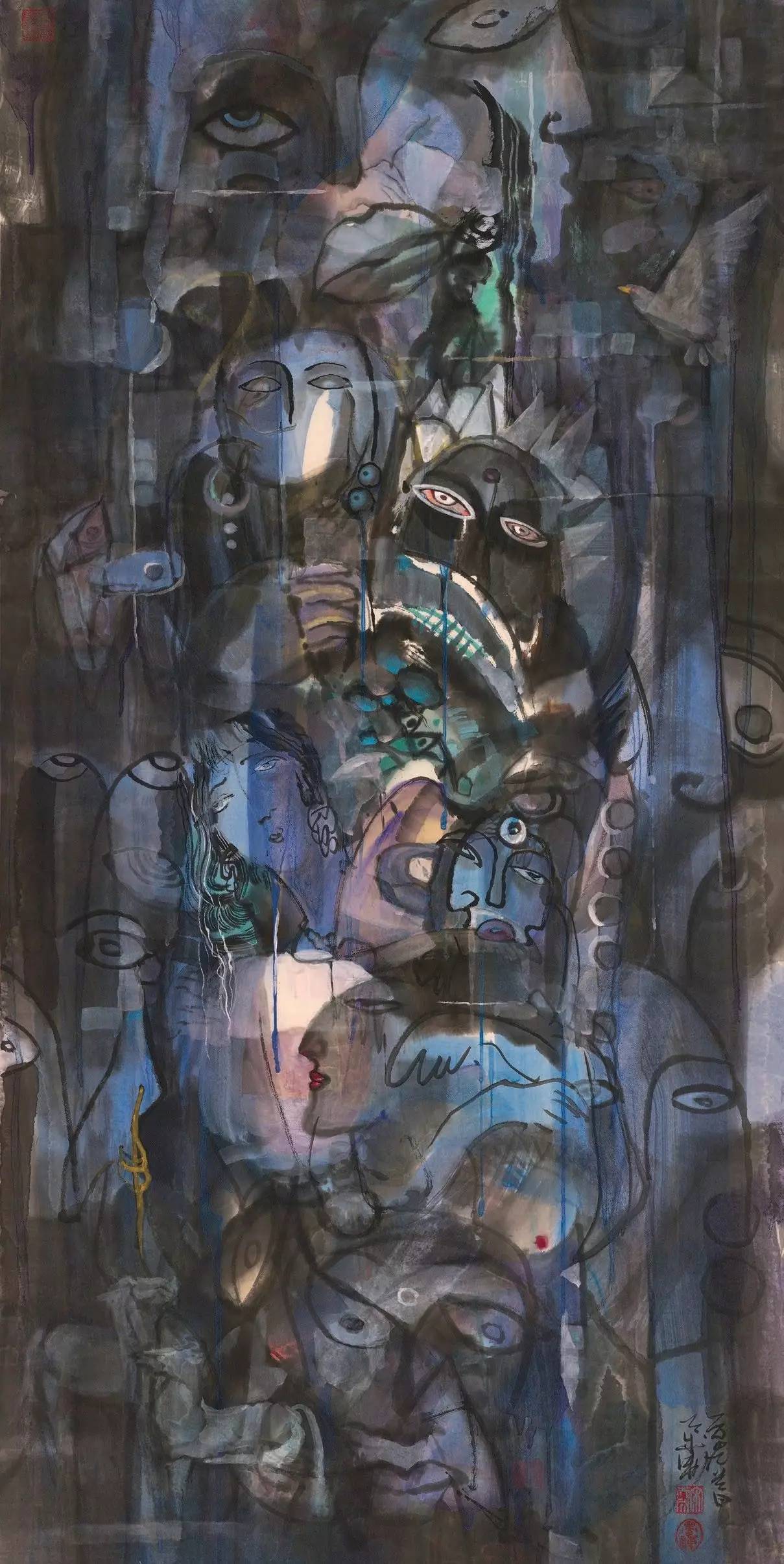 在绘画艺术领域,传统与当代就像一对不得不聚头的冤家,见不得也离不得。相应地,画家们就有了对待传统与当代的不同表现。有的画家是古非今,常怀“九斤老太的秤——代不如一代”之惑,有的画家又没有历史感,把当代与传统视为时间上不相干的前后两段。 其实传统与当代在一定语境下根本就是一体。三百年前苦瓜和尚提出“笔墨当随时代”,并不表示这位艺术高僧否定传统,相反这正是他在承接了传统的当代里,对未来接续传统所作的承诺。作为身处大数据时代的画家,天成当然知道传统艺术与当代艺术不可分割的承续意义。而作为居住在地球村里,有着文学学士、艺术硕士教育背景的画家,天成更清楚“当代”所涵容的东西方艺术的时空流转和交汇意义。所以当他以中国传统文化为血脉,以东西方绘画的形态为筋肉、骨架,以现当代的艺术表现为面貌去“画自己的心,和画心里想画的”(天成语)人物时,自然而然就有了《人物系列》亦中亦西,亦古亦今,且有别于经验人物画的面貌。 一 人物画就是画人物及其人物相关,自古皆然,东西同意。无论工笔意笔,还是油彩水墨,抑或写实写意,印象抽象,都以个体、群体人物的形象行为表现作为主题或主体。如梵高《自画像》中表情倔强叛逆的梵高,顾恺之画脸颊上有三毛的裴楷,大颧骨凸显的苏东坡,以及叉腰挥手,额头与下巴同样突出的列宁等,就是个体的人物形面貌表现。达维特的《拿破仑一世加冕大典》,顾闳中的《韩熙载夜宴图》,阎立本的《步辇图》则是围绕中心人物展开的人物群体关系和行为的肖像、肖形集合。而蒋兆和的《流民图》是从历史的断面和社会的层面,描述了一个悲剧时代里的不同角色人物,如大海芥舟一般沉浮生灭的命运。 上述这些古今中外的人物画代表作,无一例外不是以人物的“像”作为出发点和归宿。即使毕加索的立体主义人物画,也是另外一个意义或层次上的“像”,或“像”的重组。沈括曾在《梦溪笔谈》中指出:“世之观画者多能指摘其间形象、位置、彩色瑕疵而已,至于奥理冥造者罕见其人”。这也表明,“像”是古今中外包括人物画在内的绘画艺术的规定或经验所在。 基于对“奥理冥造”的追求,天成认识到如果自己完全服从于对社会“人”和自然“物”关系的人物经验体认,就必然堕入炒陈饭的艺术怪圈,只会搞一些人物变形、丑化、扭曲、夸张、冲击眼球的小动作。要想有艺术上的突破,就必须在人物画的形象、位置、色彩经营上有所作为。为此天成从全时、全域、全人物的大观念出发,打破人物画肖形肖像的定式,建立《人物系列》纵、横、里、外的开放格局,使之具有涵盖社会、自然的人物画广义性。 二 这不是想当然的“神马”创作,而是在数学集合论支撑下的人物画艺术创新。也就是说天成的人物画是不同性别不同年龄,及工人、农人、商人、学人、军人各行各业,各色各类人等的联集、交集,是古人今人的集合。是人物及其社会关系、自然关系的集合,乃至集合的集合。由于集合本身内含与外延的无限性意义,突破了人物形貌言行等自然属性、社会属性限制,因而天成的人物画有了去人物形质和人物联系的概念化、抽象化的全景式独有表现。 换句话说,《人物系列》的数学集合论要求,决定了画家不可能也不应该去经验地完成包括所有人物及人物内在联系和外在关系清晰、完整的形象行为描述。因而不会有像高小华的《赶火车》,和张择端的《清明上河图》一样的写实、记录面貌。也不会有德拉克罗瓦的《自由引导人民》那种表现主体人物的形象行为,体现生死冲突,呼唤人性解放的功能表达。这因此也出现了一个问题:《人物系列》若是只遵从于全覆盖人物的数学集合原则,就不能满足人物具象或人物的“像”,也就不成其为通常意义上的人物画。但是如果满足了人物画“像”的规定,就不可能实现人物的集合要求。因而,对作为人物画的《人物系列》而言,其主题与主体的表现无论“像”还是“不像”都是问题。 数学模糊聚类方法,用不像之像和像之不像的意象或形象,四两拨千斤地解决了这一困绕《人物系列》的两难问题。所谓模糊聚类,就是依据客观事物的特征、亲疏程度和相似性,建立模糊相似关系,对客观事物进行分类的模糊数学方法。这个方法在《人物系列》遵循人物动态、行为、衣装、五官、肢体“像”的规定的同时,通过模糊聚类主动忽略人物高矮、胖瘦、美丑、鲜艳、保守、忙、闲……的形象行为之“像”。通过模糊聚类以上级下级、远近亲疏、贫穷富贵、情绪情感、思想理想……的“不像”,成就人物外在社会关系和内在自然联系之“像”。也就是《人物系列》通过模糊聚类消解人物表现的细节,摆脱了人物个性或共性,自然属性和社会属性的束缚,满足了集合论的全人物要求,同时,满足了模糊聚类的人、自然,社会及其三者之间复杂关系和广泛联系的广域性表现需要。 如果说数学的集合论广大了《人物系列》的外延,模糊数学的模糊聚类丰富了《人物系列》的内涵,那么二者就在中国传统哲学之“道”的思想统驭下,将数学思维转化为艺术认识,明晰了“道之为物,惟恍惟惚”,和“惚兮恍兮,其中有象,恍兮惚兮,其中有物”的“模糊”艺术路径。这种模糊,不是稀里糊涂,更不是一塌糊涂,而是在“惟恍惟惚”的人物全部