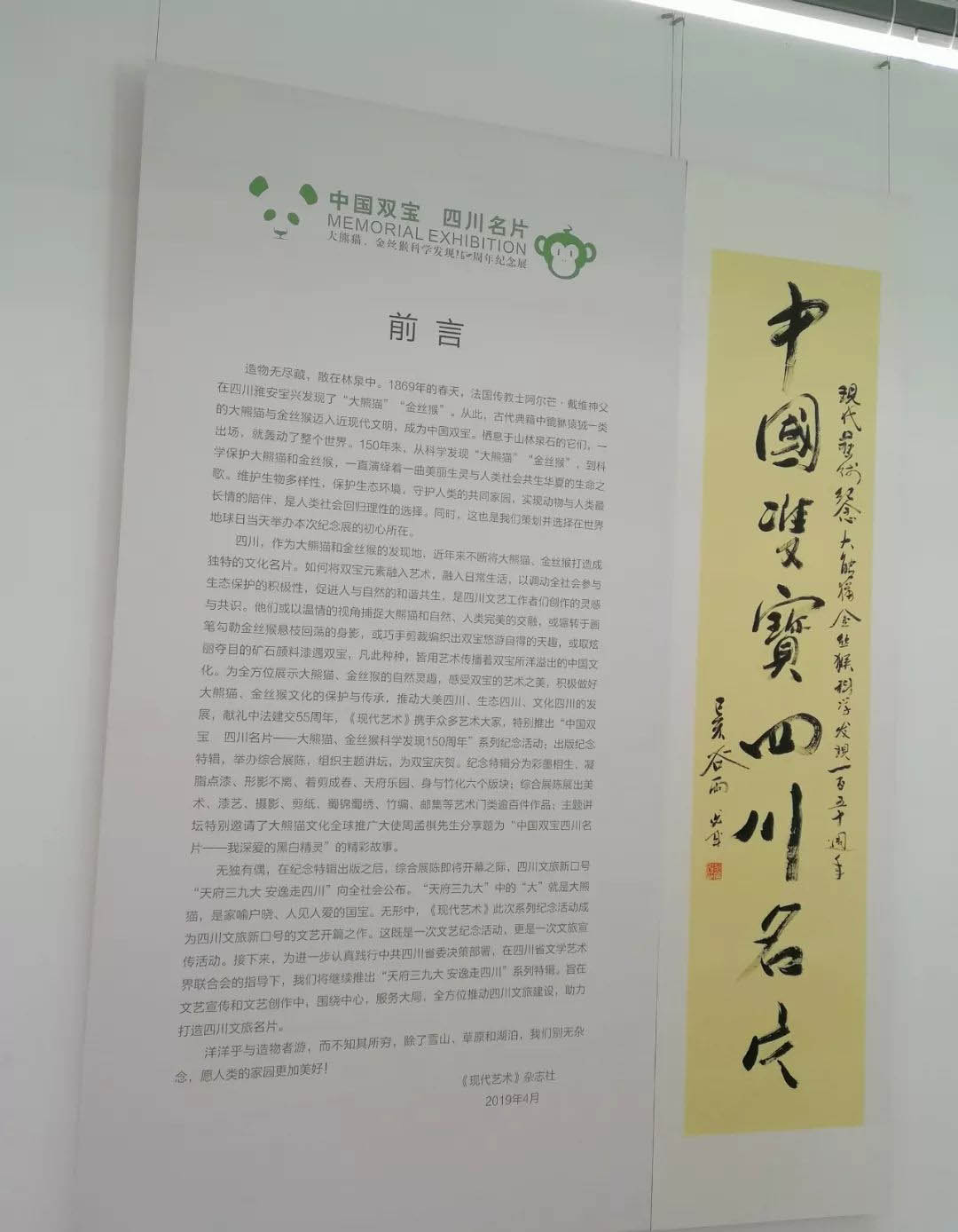 指导单位:四川省文学艺术界联合会 主办单位:中共成华区委宣传部 《现代艺术》杂志社 承办单位:福宝美术馆 四川省文艺期刊联合会 四川天娇大熊猫画院 协办单位:四川国颂书画院 北京巴蜀书画艺术院 开幕时间:2019年4月22日 展览地点:福宝美术馆(成都市成华区崔家店路371号)