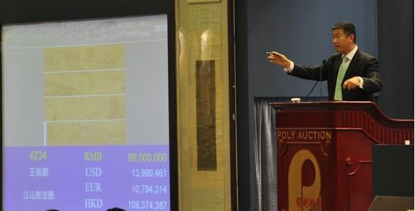 2012年12月4日晚,北京保利2012秋拍“古代书画夜场”在亚洲大酒店举槌,其中王振鹏的《江山胜览图卷》以8800万元价格落槌,加佣金1.012亿元,成为内地2012秋拍首件亿元拍品。