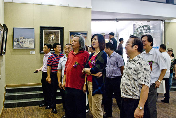 市文联副主席郭月与市美协主席刘正兴观看画展