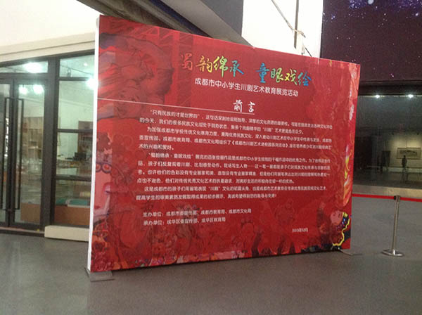 “蜀锦绵承 童眼戏绘” 成都市中小学生2013川剧艺术教育展示活动美术作品展,收集作品600余件,精选200多幅水墨丹青、剪纸贴画的学生作品,于10月19-20日在东郊记忆成都艺术超市隆重开幕。3000余教师、学生、家长及社会人士参观会展。此画展是由成都市委宣传部、成都市教育局、成都市文化局主办,成华区委宣传部、成华区教育局承办。