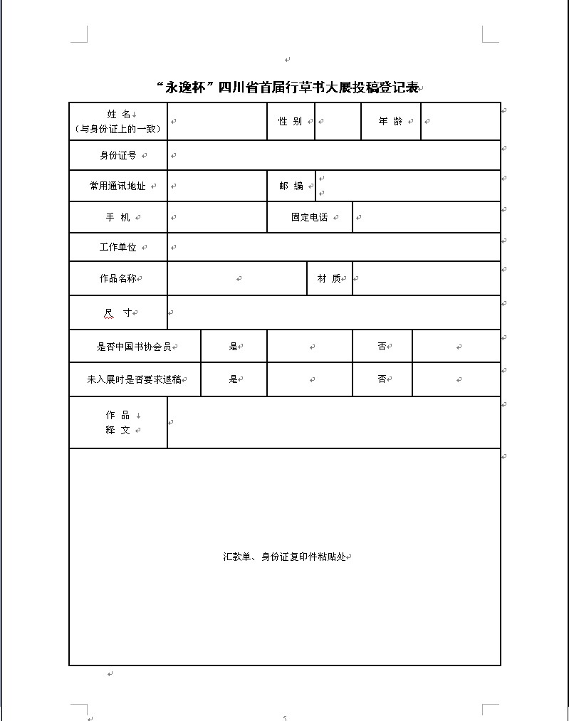 为继承和弘扬我国优秀传统书法艺术,鼓励全省及全国川籍书法作者,全面展示我省行草书艺术成就,推动四川省书法艺术事业的稳定健康发展,四川省书法家协会决定举办“永逸杯”四川省首届行草书大展。 一、举办单位 主办单位:四川省书法家协会 承办单位:四川省书法家协会行草书专业委员会 遂宁市文联 四川永逸集团 遂宁市书法家协会 二、组织机构 “永逸杯”四川省首届行草书大展组委会 主任委员:何应辉 副主任委员:戴 跃 刘新德 唐文清 何开鑫 吴 杰 组委会办公室:唐 昊 钟宣秋 三、作品 1、书法作品书体仅限于行草书。竖式:不超过六尺整张宣纸(180cm×97cm,包括装饰衬纸);册页:不超过12页,每页高不超过40cm,宽不超过30cm;横卷:高不超过40cm,长不超过260cm。不收刻字作品。所有作品请勿装裱。不符合尺寸要求者不予评选。 2、征稿范围:四川省年满18周岁以上的公民以及全国川籍书法家及爱好者均可投稿。可通过上述各市、州书法家协会推荐并集体送稿;上述作者也可自由投稿(即直接寄送),作品件数不限。 3、费用:每一件作品收参评费30元(请勿在信封中夹寄),没收到参评费的作品不予评审。未入展者如需退稿,退稿费50元,在投稿时与参评费一并汇寄至组委会办公室(并在投稿登记表及汇款单上注明退稿信息)。 4、填写信息: 请在作品背后右下方用铅笔正楷注明:姓名、性别、身份证号、所属省份、常用通讯地址、邮编、联系电话(固定电话、手机),草书请附释文,或注明内容出处。为便于准确登记,及时联系作者,请另打印填写《“永逸杯”四川省首届行草书大展投稿登记表》(启事后附表格,可复印使用),连同身份证复印件、汇款单复印件,随作品一并寄出。组委会根据作者提供的信息做好收稿登记工作。 5、备注:投稿作品落款一律使用真实姓名,勿用笔名;发现临摹、抄袭已在公开出版物发表的古今作品(含古代碑帖集字、集联)不予评审;鼓励书写完整作品,不提倡拼贴、染色、做旧等形式。禁止一稿多投。 四、评审 1、由四川省书法家协会组成本次大展评委会,制定评审细则和评审工作流程; 2、评审工作于2014年10月在成都市举行,由主办方核对原作准确无误后,及时公布评审结果; 3、明确违规作者的处理办法。评审期间可能对部分优秀作品和入展作品的作者进行抽查或面试。 五、展览与出版 本展于2014年12月中旬在成都市举行,展出入展作品280件,其中:特等奖1名,一等奖4名,二等奖10名,三等奖20名,优秀奖30名,其余为入展。本展开幕式之前出版《“永逸杯”四川省首届行草书大展作品集》。 六、作者待遇和相关责任 1、向获奖作者颁发奖金、证书;全部入展作者每人颁发证书并赠送本次展览作品集两册。 2、获奖作品作者奖金:特等奖30000元;一等奖10000元;二等奖5000元;三等奖2000元;优秀奖800元。 3、非省书协会员作者获奖可直接加入省书协,入展本展,具备加入省书协条件之一。 4、本次活动获奖作者奖金、获奖及入展作品证书和作品集由主办方负责在展览开幕后一个月之内发放。 5、退稿作品由主办方负责在展览开幕后一个月之内退回。 七、征稿日期 本启事自公布之日起征稿,至2014年9月20日截止征稿,以当地邮戳为准。