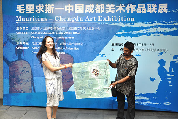 8月5日,由成都市人民政府外事办公室和成都市文学艺术界联合会主办,毛里求斯美术家协会和成都市美术家协会共同承办的“毛里求斯-中国成都美术作品联展”在成都“文艺之家”开展。这是成都与东非国家在文化艺术领域的首次交流与对话。 活动当天,毛里求斯美协会主席德夫?舒拉曼先生携带9位毛里求斯艺术家的十余幅精美作品亲临成都,与成都艺术家的作品共同展出。市政府外事办和市文联分管领导出席开幕式并致辞祝贺,市美协领导以及部分著名艺术家和广大艺术爱好者到场观展。 此外,德夫.舒拉曼来蓉访问,与成都市美术家协会进行“中-非艺术对话”,将在成都市和都江堰市分别与当地美术家协会共同举办 “毛里求斯-成都艺术作品联展”,并开展“感受成都,描绘成都”艺术之旅活动,本次参展的毛里求斯画作将于8月8日移至都江堰文化馆,与都江堰艺术家的作品共同展出。 活动结束后,舒拉曼先生将把成都印象及相关创作品带到毛里求斯,创作更多关于中国成都的作品,让更多的毛里求斯国民众认识了解成都。