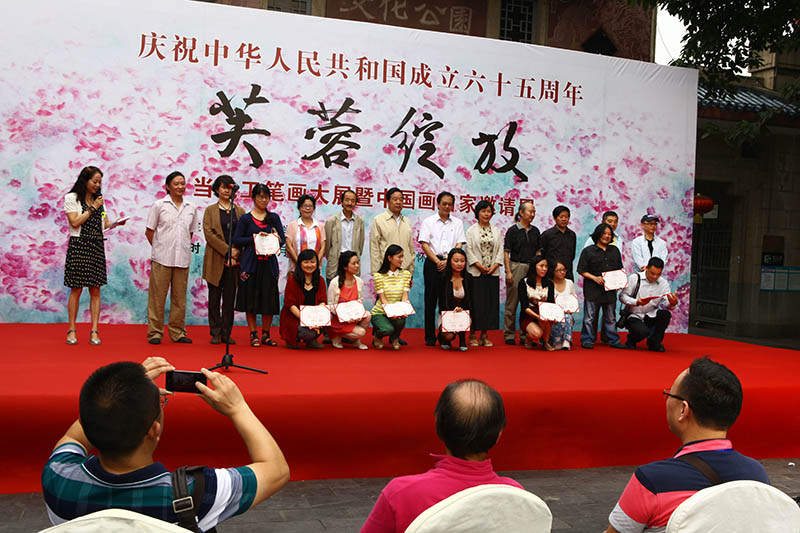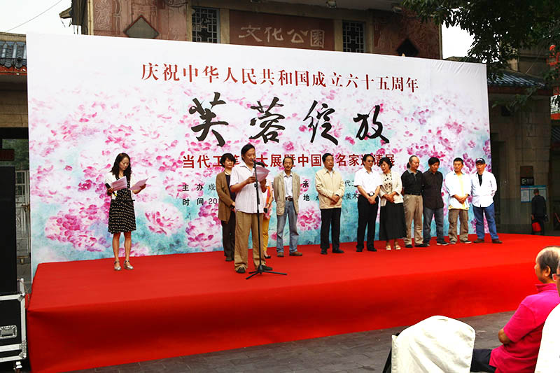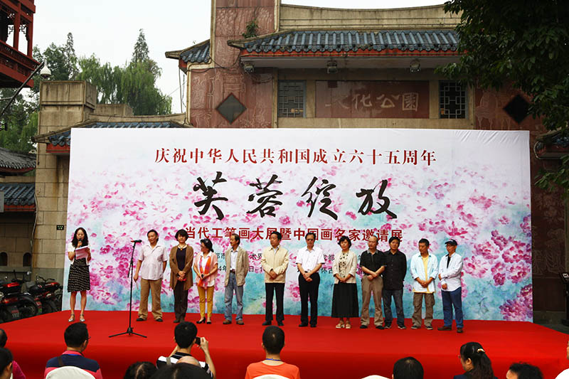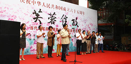 庆祝新中国成立65周年,“芙蓉绽放”当代工笔画大展暨中国画名家邀请展在成都怀古堂美术馆举行。 成都古称“益州”,北宋《益州名画录》记载五代画家以四川、江南为最,成都的书画艺术源远流长。公元935年,后蜀主孟昶在成都建立了中国第一个皇家画院——翰林图画院,聚集了当时许多优秀画家,如刁光胤 、滕昌佑、李升、薛稷、龙孙遇、黄荃、黄居寀等,尤以黄荃为蜀王所重,极享盛名。这也是蜀中工笔画发源和昌盛之端,从此这里便与书画结下了不解之缘。画院画师黄荃开宗立派,遂成工笔画派先河。宋时,黄荃将西蜀宫廷画风带入宋画院,其时画院无不以“黄氏体格”为标准,统治了北宋画院宫廷花鸟画风近一个世纪,影响深远。历代名家辈出,由此中兴,特别是上世纪三四十年代,蜀中书画艺术,又达到了一个高峰。出现了张大千、张善仔、蒋兆和、吴一峰、陈子庄、周抡园 、李琼久、冯建吴 、苏葆桢、朱佩君等工写皆善的艺术大师、大家,名播中外,影响巨大。当代蜀中工笔画界,吴绪经、张自启、姚思敏、江溶、李青稞、高晓笛、王申勇等,画风自成,各领风骚。新锐人物有安华平、向洋、刘刚等在承袭传统中融入己意,以独自的艺术表现形式,更为广泛的题材,成为蜀中工笔画界的接力之才。承续传统、创新发展,始终是巴蜀艺术发展的动力之源,可见,成都是中国工笔画的重要发祥地之一,千百年来,成都的工笔画家在继承中创新,在创新中沉淀,画家们以扎实的创作实力在各大展赛中频频获奖,在全国工笔画领域发出了强烈的声音。 当代的工笔画发展,在今天呈现出更加多元、更加复杂的发展态势,传统工笔画也更具包容性,更倾向于写意性、意象性的表达。在各种艺术思潮相互碰撞的今天,在各大新兴艺术流派涌现的今天,当代工笔画正处在一个重要的转型期,如何直面挑战,乘势而上,乘势而为,这是我们每一个工笔画人都应该思考的。此次展览集结了来自全国的王裕国、莫晓松、李大成、郑雅风、陈子等70余位工笔画名家,同时还从400余幅作品中评选出金芙蓉奖10幅、提名作品19幅、入选作品100余幅,这些作品不仅代表着成都本土当代工笔画的最高创作水平,也是对全国当代工笔画发展状态的一次整体呈现。 千年芳华,芙蓉绽放!千年的艺术文脉,在今天、在成都重新绽放出更加灿烂的光彩。此次由成都市文学艺术界联合会主办、成都当代工笔画研究会承办的全国性当代工笔画大展,众多工笔画大家的精品力作在此呈现,充分说明成都的工笔画发展在全国有目共睹,成都的工笔画家在全国具有一定的影响力和感召力,希冀成都将来能够成为中国当代工笔画的创作和研究重镇,我们以此共勉!
