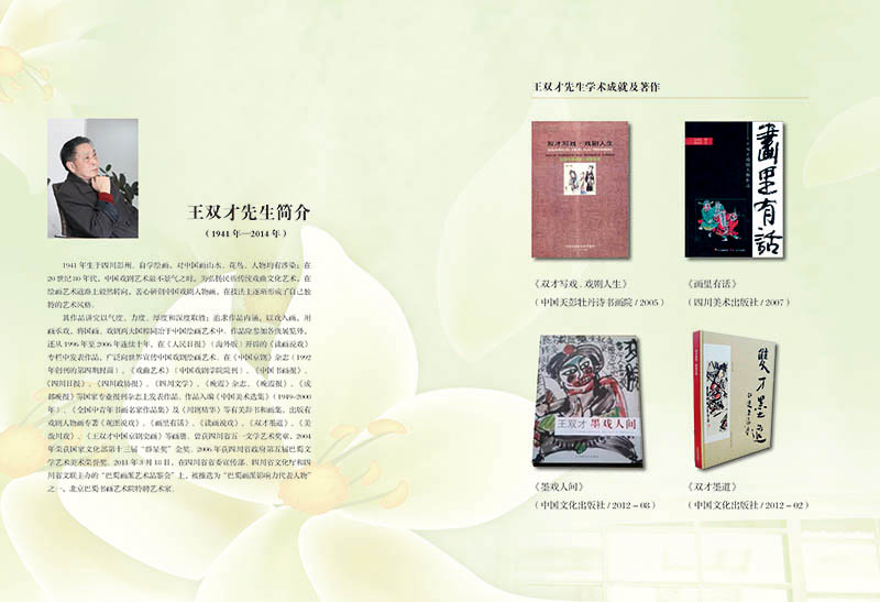 王双才学术成就: 《双才写戏.戏剧人生》(中国天彭牡丹诗书画院/ 2005) 《画里有话》(四川美术出版社/ 2007) 《读画说戏》( 四川出版集团/ 2011 - 07) 《罗汉春秋图》(福宝印务设计有限公司/2009) 《观图说戏》(王双才绘图・黄光新等撰文/四川美术出版社/ 2000 - 09) 《双才墨道》(中国文化出版社/ 2012 - 02) 《墨戏人间》(中国文化出版社/ 2012 - 08) 《美哉川戏》(中国文联出版社/ 2012 - 11) 《纵情:王双才歌舞画集》(成都鼎艺文化公司/ 2013) 《彭州国色——王双才牡丹作品专集》(中国文联出版社/2013 - 08) 《家乡美》(向氏文化传播有限公司/2013) 《蜀中三怪》(成都鼎艺文化传播公司/成都画院/ 2013 - 01) 《中国京剧史画》(待出版)
