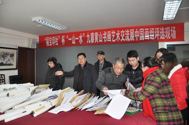 “福宝印社”杯“一山一水”九寨黄山书画艺术交流展评选于2015年1月13日下午在福宝印社学术厅圆满结束。评选出优秀作品10件,入选作品油画34件,书法19件,中国画86件。 “福宝印社”杯“一山一水”黄山九寨书画艺术交流展,报经四川省文学艺术界联合会,申请省文联作为主办单位,得到批准后,画展筹委会立即着手画展的各项准备工作。 征稿工作从2014年10月开始, 书画交流展征稿启事先后在《华夏大家》《中国画风》《将军艺苑》等专业艺术杂志;雅昌艺术网、雅昌论坛、四川书画艺术网等专业艺术网站、“福宝印社”微信平台先后登发并得到同行多家艺术机构的广为转发;在省内、国内及国际产生了广泛影响,效果颇佳。 应征者投稿积极踊跃,截止2014年12月31日止,画展共收到书画作品共459件,其中:国画275幅、油画97幅、书法87幅。 稿件来自全国各地:四川、湖南、江苏、河南、福建、江苏、浙江、重庆、安徽、山东、济南等省份; 安徽黄山画院高度重视、由院长李小可工作室集体创作6米黄山主题巨制大作、5幅黄山主题画作,参加本次艺术交流展。 更有来自法国蓬毕杜艺术中心画家索菲、俄罗斯列宾艺术学院功勋艺术家莉莎准备送作品参展;美藉画家黄薇更专程从美国寄来作品参展,足见其画展的广泛影响。 征稿结束后,画展筹委会于2015年1月6日,在“福宝印社”学术厅举行了画展筹备会,商议作品的评选日期、评委会组成、画展开幕、作品的出版、作品装框、展览场地、获奖作者产生办法等具体事宜进行了布署安排,并一一落实执行。