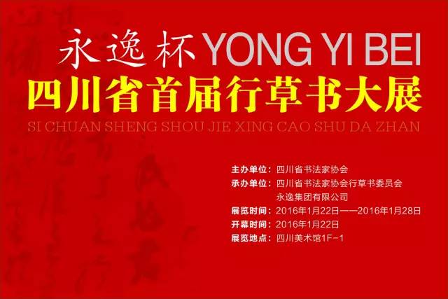 四川书法艺术周系列活动之“永逸杯”——四川省首届行草书大展 主办单位:四川省书法家协会 承办单位:四川省书法家协会行草书委员会 永逸集团有限公司 展览执行:四川省福宝斋文化传播有限公司 开幕时间:2016年1月22日上午10点 展览时间:2016年1月22日~2016年1月28日 展览地点:四川美术馆 媒体支持:雅昌艺术网 中国美网 四川美术网 文轩网 艺术圈网 华夏艺术网 四川书法家网 99艺术网 中国原创艺术网 华西都市报 成都商报 四川日报 成都日报 四川电视台公共频道 四川书画艺术网 四川艺术网 四川新闻网 四川美术 《读城》杂志 《现代艺术》杂志 《四川报道》杂志社 《上层》杂志