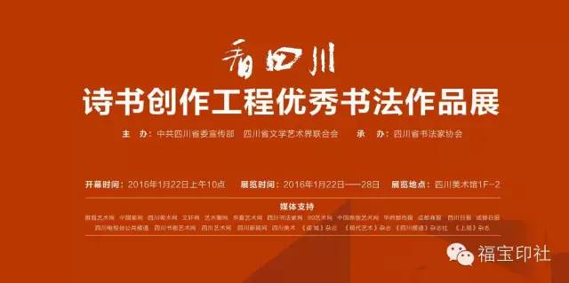 主办单位:中共四川省委宣传部 四川省文学艺术界联合会 承办单位:四川省书法家协会 开幕时间:2016年1月22日上午10点 展览时间:2016年1月22日—31日 展览地点:四川美术馆 媒体支持: 雅昌艺术网 中国美网 四川美术网 文轩网 艺术圈网 华夏艺术网 四川书法家网 99艺术网 中国原创艺术网 华西都市报 成都商报 四川日报 成都日报 四川电视台公共频道 四川书画艺术网 四川艺术网 四川新闻网 四川美术 《读 城》杂志 《现代艺术》杂志 《四川报道》杂志社 《上层》杂志