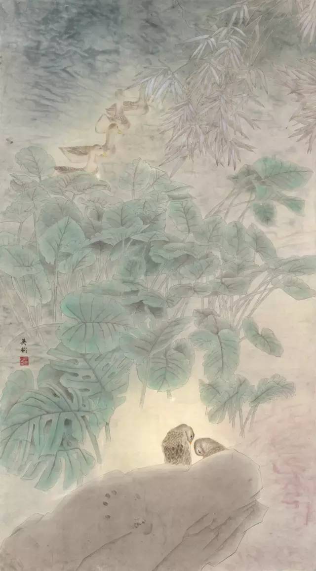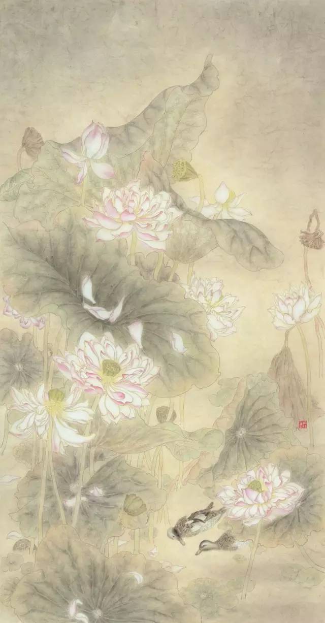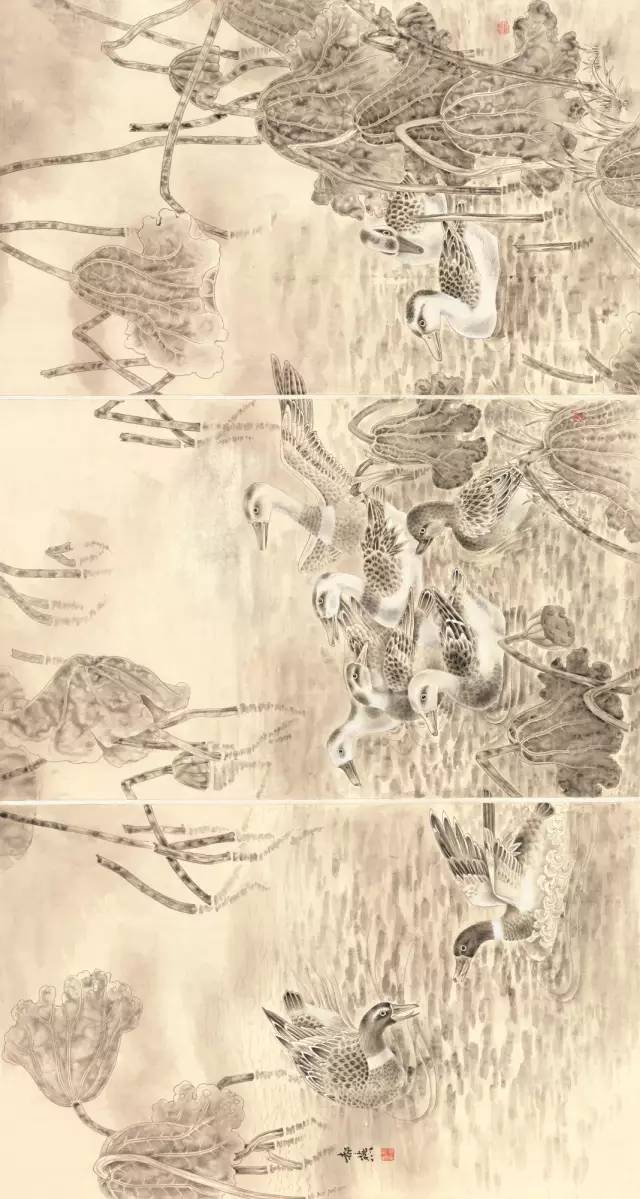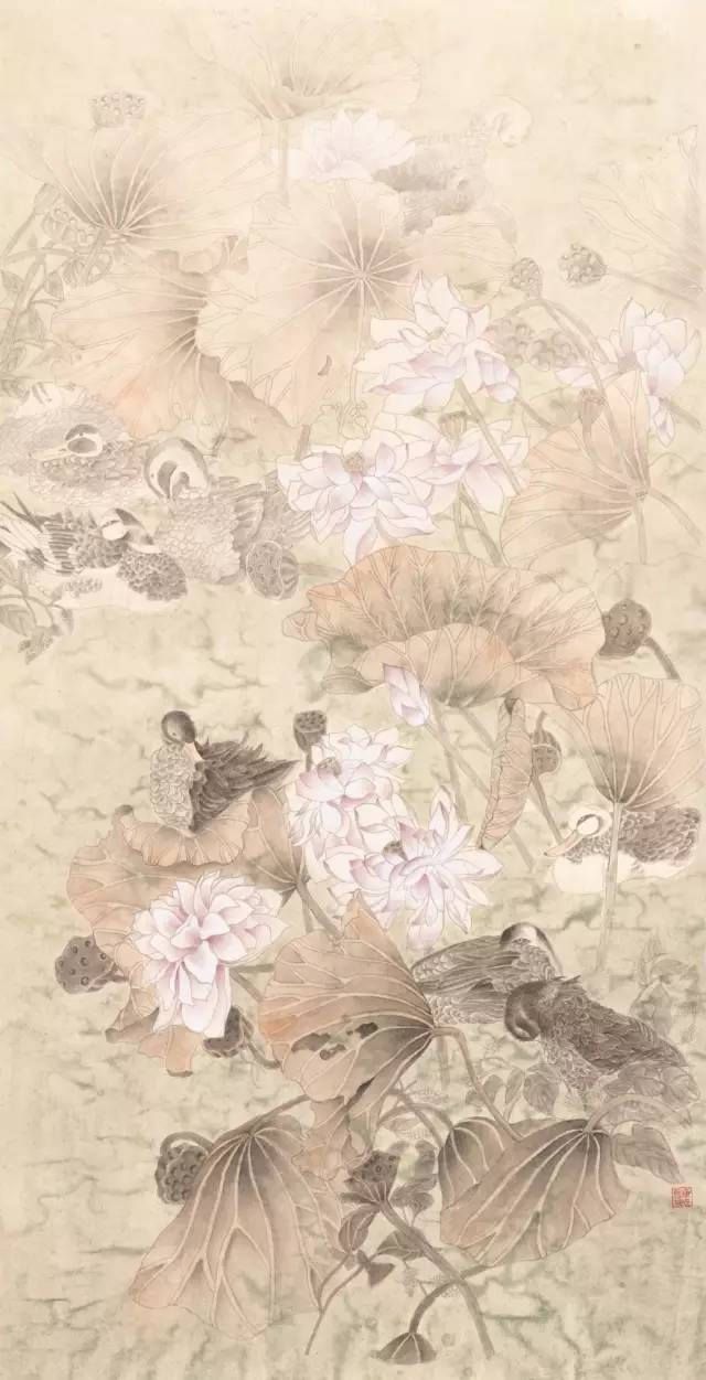 入选作品:喻佳丽《荷塘戏鸭》174cm×90cm