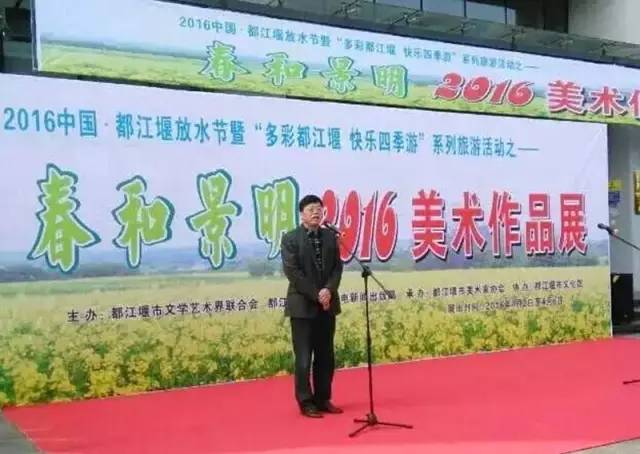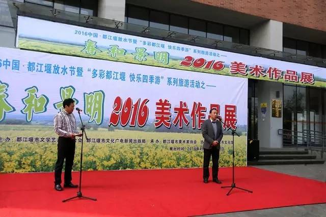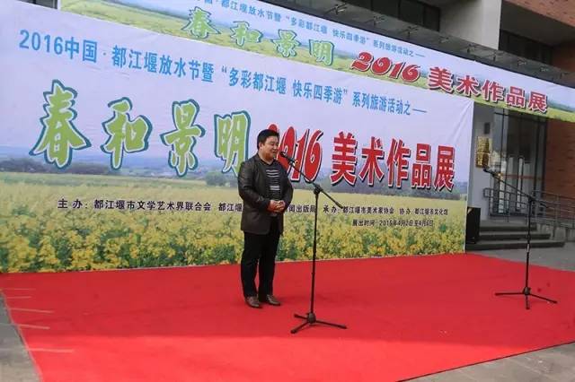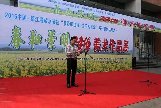 胜日寻芳岷江滨,无限风光四時新。等闲识得东风面,万祡千红总是春。春天来了,是梦想的到来,更是希望的开始。沿着春天的脚步奋勇前行,那就是梦想成真的地方。 今天我们在这里举办“春和景明”2016美术作品展!其宗旨是为贯彻落实党的十八和十八届三中、四中、五中全会精神,紧扣都江堰市委、市政府“创新发展、转型升级”发展主题、“一城两区发”发展架构和“三步走”发展战略,努力提高我市文化软实力,弘扬中华文化精粹,丰富我市清明国际放水节系列文化活动,推动我市绘画艺术的发展与繁荣,让我市的旅游与文化艺术相结合、城市与文化紧紧相融。 这次展出的作品都是美协艺术家创作的最新力作,作品形式多样,立意新颕,其中不乏主题突出,艺术特色鲜明的佳作。他们或泼墨泼彩抒以心志;或以工笔钩染抒己情怀。从这一幅幅充满浓郁的家乡气息作品中,我们真切的感受到了画家们对故乡的那份深情!那份爱恋! 写胸臆,泼翰墨丹青于华章;化妙境,洒绿色情怀于笔端。希望他们用更加厚重,更加芬芳、更加传神的笔墨去抒写这个美好的时代。为我市加快推进成都旅游休闲度假卫星城和国际旅游城市建设贡献力量。