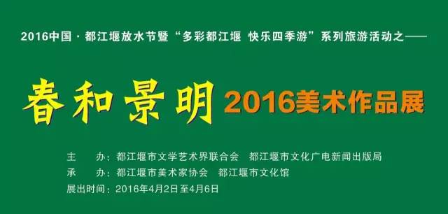 主 办:都江堰市文学艺术界联合会 都江堰市文化广电新闻出版局 承 办:都江堰市美术家协会 都江堰市文化馆 展出时间:2016年4月2日至4月6日