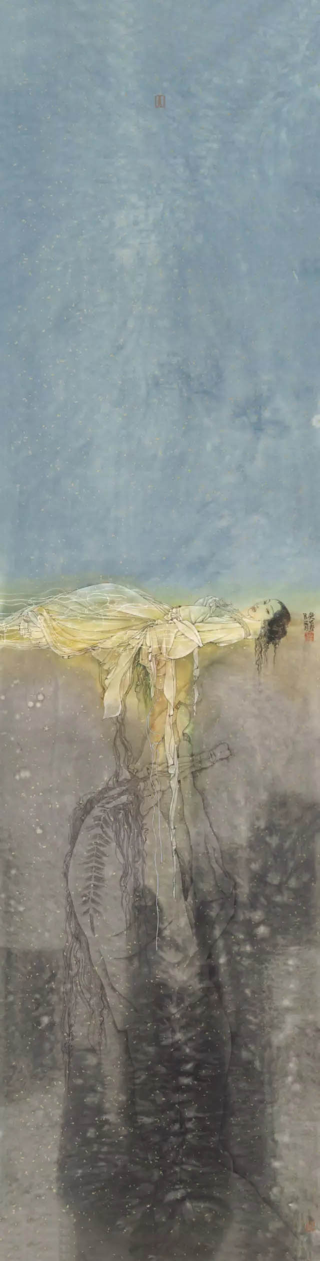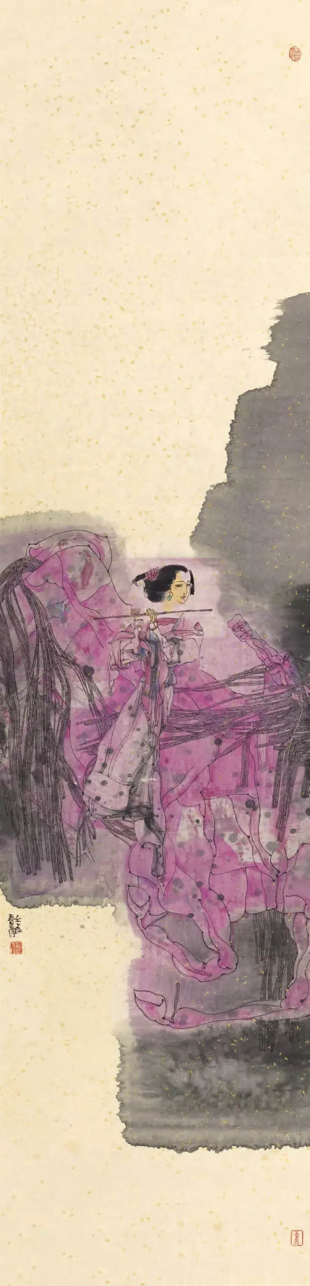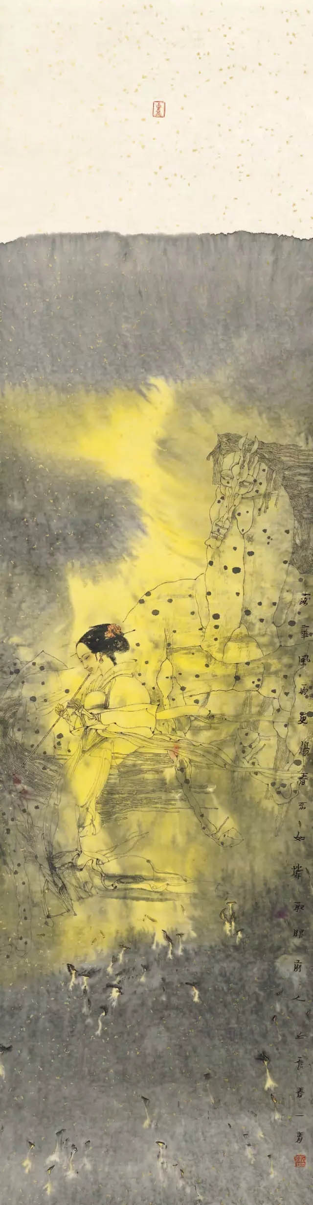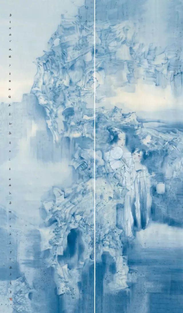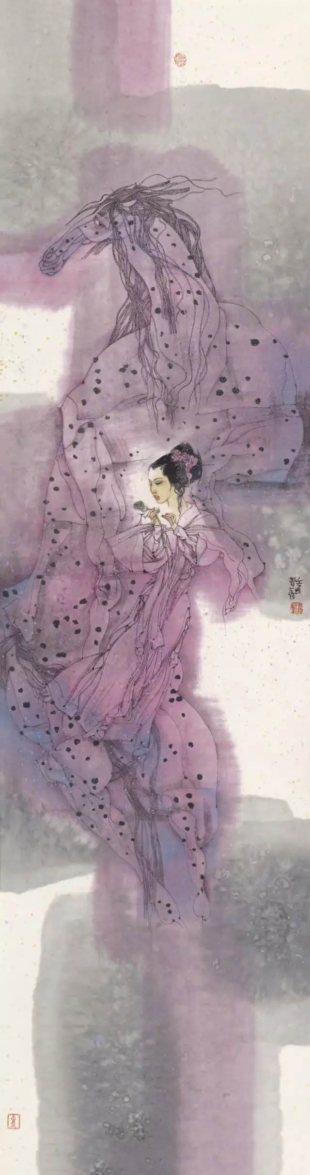 苏茂隆100余幅的仕女图作品,将我对古典仕女图的阅读经验和观看经验进行了一次彻底的清洗和置换。尽管我依然使用千娇百媚来提取概括我对苏茂隆现代仕女绘画的视觉感受,但我深信《百媚图》仅仅是就苏茂隆绘画的题材而言才能构成相应的说服力。事实上,苏茂隆的艺术创作经验早已从根本上超越了仕女图其已有的视觉审美积淀和已有的文化内涵,甚至在我看来,苏茂隆的仕女图也已经从根本上超越了画家自己对仕女题材的记忆和审美期待。 我之所以这样来认定苏茂隆的现代仕女图,简单地说,画家在创作过程中,其无法逃避的当代女性视觉信息时刻都在颠覆画家记忆中的仕女形象和仕女情景。我们都知道,中国历代画家创作的仕女图,无论个人风格怎样突出和明显,其塑造的仕女人物形象都不可能超越仕女特定的性别地位和仕女的文化形象。查阅有关仕女的资料,我们都知道: (1)仕女是古代宫中侍奉君王后妃的女子。唐代诗人杜甫在《观公孙大娘弟子舞剑器行》一诗中写到:“先帝仕女八千人,公孙剑器初第一”。 (2)仕女在旧时指婢女,女仆。 (3)仕女旧指从事服务工作的女子。不管是侍奉君王后妃,还是从事服务性的工作,仕女在古代中国的地位都只能是仆人的身份。不仅如此,仕女的地位从身体社会学的角度就已经注定了其容貌必须漂亮,必须美丽动人,而审美的主体往往不是指仕女自身,而是以君王为代表的男权社会。所以,自古以来,女人无才便是德,才子定有佳人配。佳人也罢,美人也罢,其最终都是中国古代男权制度对女性身体判断的一种表达方式。这里的审美主体肯定不是漂亮美丽女性自己,而是男权等级制度在女性身体语言等级上的视觉表现。因此,我们谁都会在中国古代仕女图的审美记忆中产生佳丽如云的视觉印象,很少看到仕女不美图的样本。 但是,当我们面对苏茂隆的《百媚图》时,其作品本相早已本再是我们对中国古代仕女图的记忆版本了。在《人马恋》系列、《岩石与马》系列、《舞者》系列、《链》系列、《街舞》系列等作品中,仕女的古典美学形象被画家有意地予以取消或者予以抹黑。尤其是在《人马恋》系列中,苏茂隆的当代视角无疑是独特的,其艺术目光无疑是锐利和深入的。白马王子作为中国传统文化中标准男性的形象在当代早已变得面目全非了。这些驰骋于权力疆场的白马,在千娇百媚的女人心目中,在她们透明的梦境中,似乎从来都是以王子模样和依靠得住的形象出现的。但是,现在却反倒在石榴裙掀起的风暴中显得弱不禁风,甚至不堪一击。两性之间的文化身份出现了一百八十度的大转弯。换一种方式说,中国历代的仕女形象都没有摆脱《诗经。蒹葭》中所描绘的情景:“所谓伊人,在水一方。溯游从之,宛在水中央”。稣胸,柔腰,含清默默,柔情似水。也许正是这样的仕女图景,使得中国古代的仕女图作为绘画艺术的自由品质得不到真正的提升和彰显。最多不过留下唐伯虎点秋香的传奇佳话以给古代的文人雅士一种心理安慰。但在苏茂隆的笔下,却出现了一种全然不同的情景:昔日的白马王子今天成为了女主人的配角,柔软多情的线条在苏茂隆的笔下变成了坚硬的岩石。也就是说,在画家苏茂隆看来,他笔下的《百媚图》不是要让观众带着习惯意义上的好色眼光去窥探历代仕女的美色,而是借用仕女图本身所具有的文化符号来传达和表现画家对当代两性社会现实的切身感受和视觉体验。或者说,画家正是力图通过变形,运用现代构成的方式去撤解中国古代仕女已有的文化结构,甚至有意去消解人们对仕女图固有的审美心态。 在我看来,苏茂隆对待中国古代仕女图的艺术创作方式,在很大程度上有杜尚对待达芬奇《蒙娜丽莎》的消解方式。所不同的仅仅是:杜尚在《蒙娜丽莎》的复制件上添上两片小胡须来改变人们对《蒙娜丽莎》微笑的神秘感,来消解古典绘画永恒的审美因素;苏茂隆采取的方式虽然不是在某一具体侍女图的复制件上实施他的现代构成行为,但其创作的意识已经全然告别了古代仕女图的视觉创作模式。 从苏茂隆《百媚图》的艺术创作指向来看。他的创作意向是十分明确的,历代仕女,不管是有名的,还是无名的;人们能记得住的还是记不住的。这一切似乎并不重要。重要的是画家可以随心所欲地按照自己对现代两性社会的现实生活状况进行判断和取舍。所以说,这些古代的仕女图只是画家的创作题材,画家完全站在现代的文化视角对中国古代浩如烟海的仕女图象资源进行符合自己现代审美要求的筛选。并由此,画家有意识地对中国古代仕女图千娇百媚的“娇”和“媚”进行彻底的清洗和捣毁,阻断人们从静态的柔软的甚至是色情的角度对画家的作品从媚俗的意义上来进行欣赏和接受,对中国古代侍女图的视觉规则进行了彻底的美学颠覆。同时,画家有意识将现代两性社会的女性坐标位置通过《百媚图》进行了大胆的视觉确认或者按照现实社会的实际状况进行了应有的调整和重新安排。为此,迫使观众不是简单地从画家的侍女图作品中去接受古代侍女图的美女信息,而是从当代女性与古代女性在地位上出现的大角度偏转引发应有的视觉思考。这才应该是画家最为核心的艺术创作隐秘。所以,我坚持认为苏茂隆的《百媚图》在很大程度上不仅是现代仕女图的一个全新视觉文本,而且事实上将