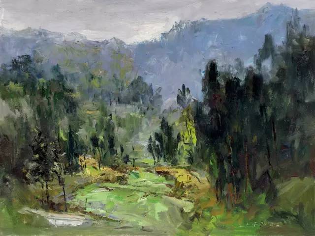 油画作品:江福建《穿越连界的大坳山》60cm×80cm