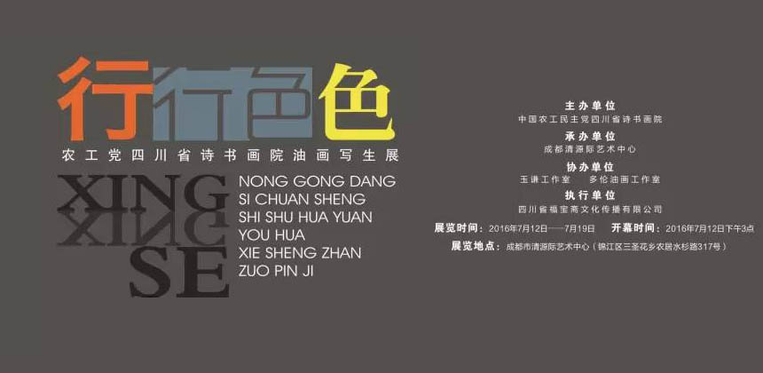 主办单位:中国农工民主党四川省诗书画院 承办单位:成都清源际艺术中心 协办单位:玉谦工作室 多伦油画工作室 执行单位:四川省福宝斋文化传播有限公司 展览时间:2016年7月12日——7月19日 开幕时间:2016年7月12日下午3点 展览地点:成都市清源际艺术中心(锦江区三圣花乡农居水杉路317号)