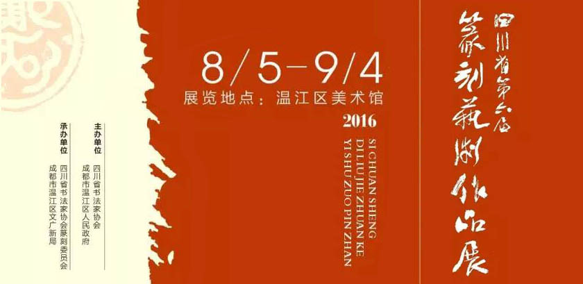 主办单位:四川省书法家协会 成都市温江区人民政府 承办单位:四川省书法家协会篆刻委员会 成都市温江区文广新局 展览执行:四川省福宝斋文化传播有限公司 展览时间:2016年8月5日—9月4日 开幕时间:2016年8月5日下午3点 展览地点:温江区美术馆 媒体支持:四川日报 华西都市报 成都商报 四川卫视 四川书法家网