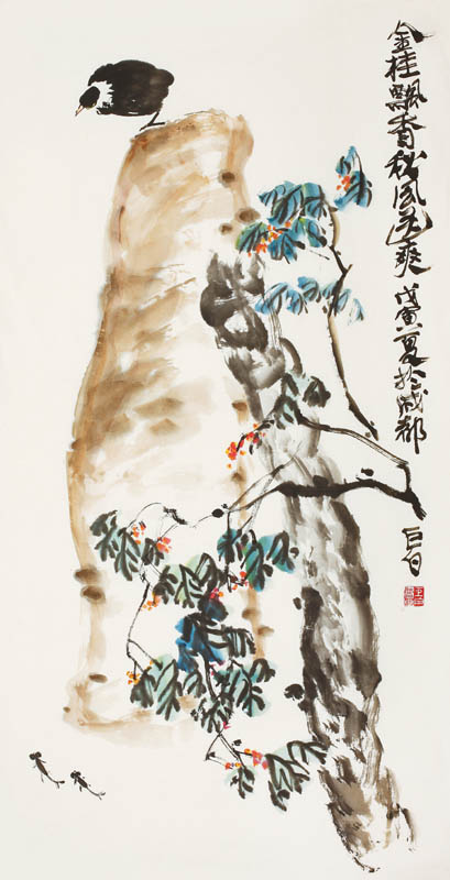 款识:金桂飘香秋风送爽。戊寅夏于成都,巨白。
