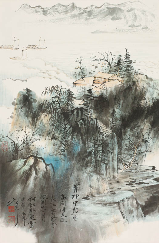 款识:高阁诸天远,长江客路分。帆开山吐月,钟动水连云。二零零五年,段七丁。