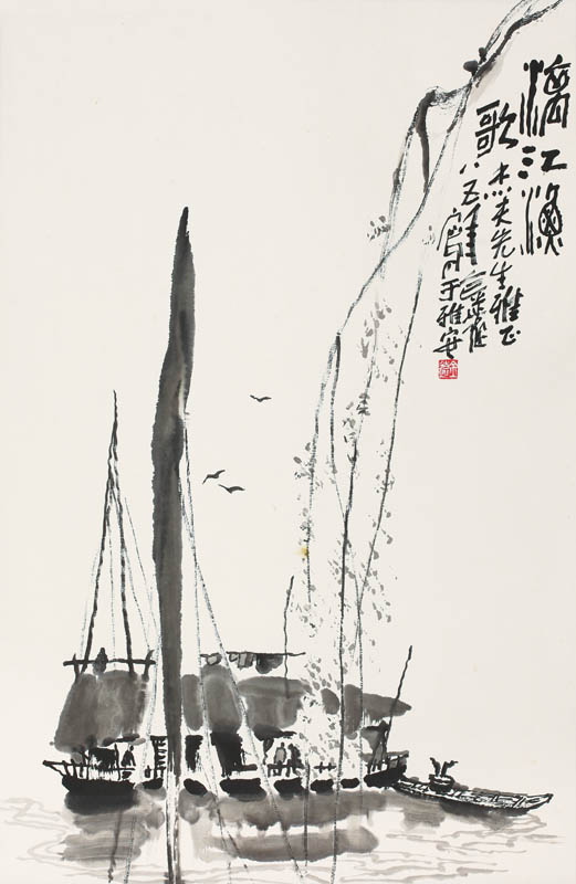 款识:漓江渔歌。杰夫先生雅正,八五年金远写于雅安。