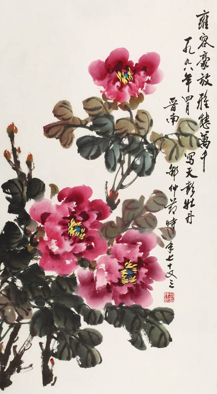 款识:雍容豪放,雅态万千。一九九八年四月写天彭牡丹。晋南邵仲节时年七十又三。
