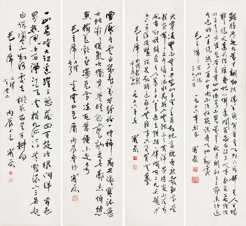 款识:1:毛主席《念奴娇·鸟儿问答》,一九七六年新春,灏原;2:毛主席《七律·登庐山》,丙辰上元,灏原;3:毛主席《水调歌头·重上井冈山》,一九七六年春,灏原;4:毛主席《七律·冬云》,光云仁兄嘱,丙辰春初,灏原。