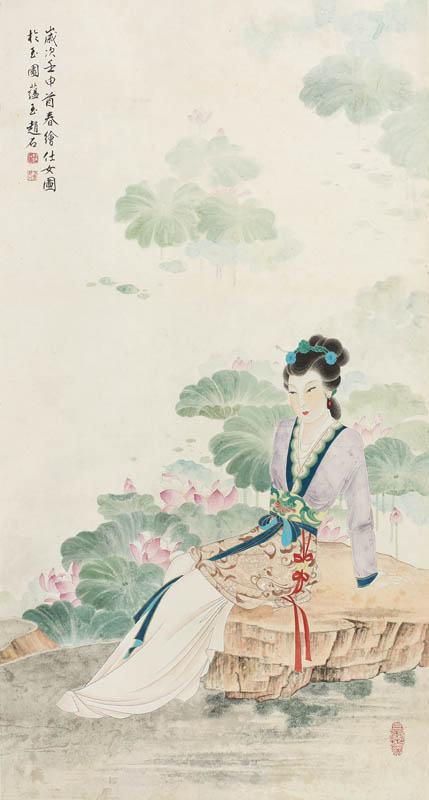 款识:岁次壬申首春绘仕女图于玉园,蕴玉赵石。
