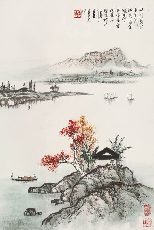 款识:千顷碧波水盈盈,渔舟荡浆镜中行。丹枫黄叶洞庭岸,灿烂秋光胜似春。黄纯尧作。