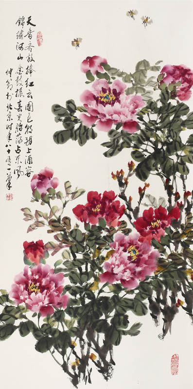 款识:天香齐放捧红云,国色朝酣上酒容。锦绣山河金鼓振,春光骀荡占东风。仲节于北京时年八十有一笔。