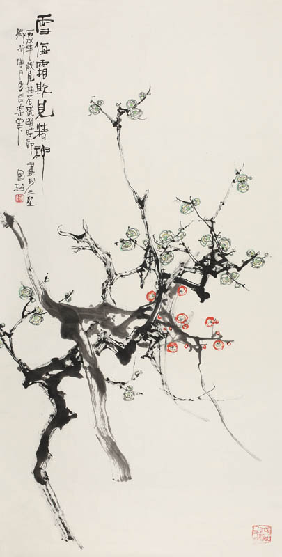 款识:雪侮霜欺见精神。丙戌年岁尾梅花盛开时节画于三圣乡荷塘月色长乐堂下,国超。