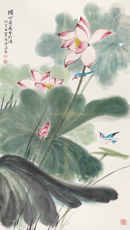 款识:媚水荷花分外娇,戊寅大寒国屏写意。