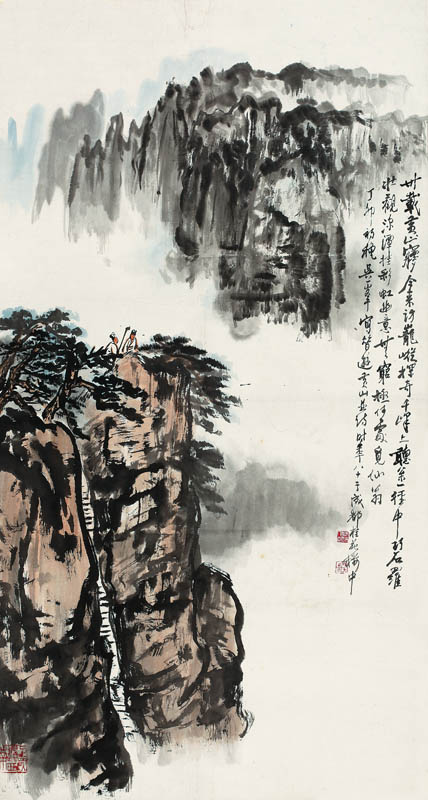 款识:卅载黄山梦,今来访茏葱。探奇千峰上,听松一径中。巧石罗壮观,深潭挂彩虹,幽意无穷极,何处觅仙翁。丁卯初秋吴一峰写昔游黄山并诗,时年八十于成都桂花楼中。