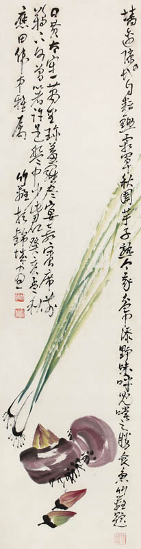 款识:日黄太牢一万金,珍馐胜尽宴嘉宾。席前簃下何曾箸,许是盘中少此君。癸亥孟秋竹篱于锦城画。墙边隙地自耕锄,霜罩秋园芋子熟。今我盆中添野味,呼儿尝之胜食鱼。竹篱题。