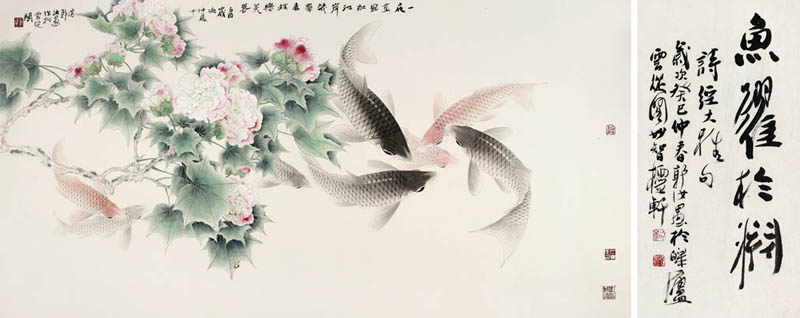 款识:本作:一夜金风红江岸,几群赤鲤恋芙蓉。乙酉岁次仲夏中浣郭汝愚作于云从阁。题跋:鱼跃于渊。诗经大雅句,岁次癸巳仲春郭汝愚于皞庐云从阁妙智棂轩。