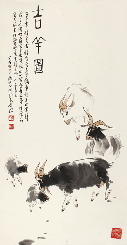 款识:吉羊图。羊吉祥矣,古祥字。元嘉刀铭宣侯王大吉祥,庄子人间世虚室生白,吉祥止止。吉者善之事,祥者嘉庆之征。羊性温顺和善,吉祥之物,人皆爱之。一九九四年岁次甲戌新春,道熙。