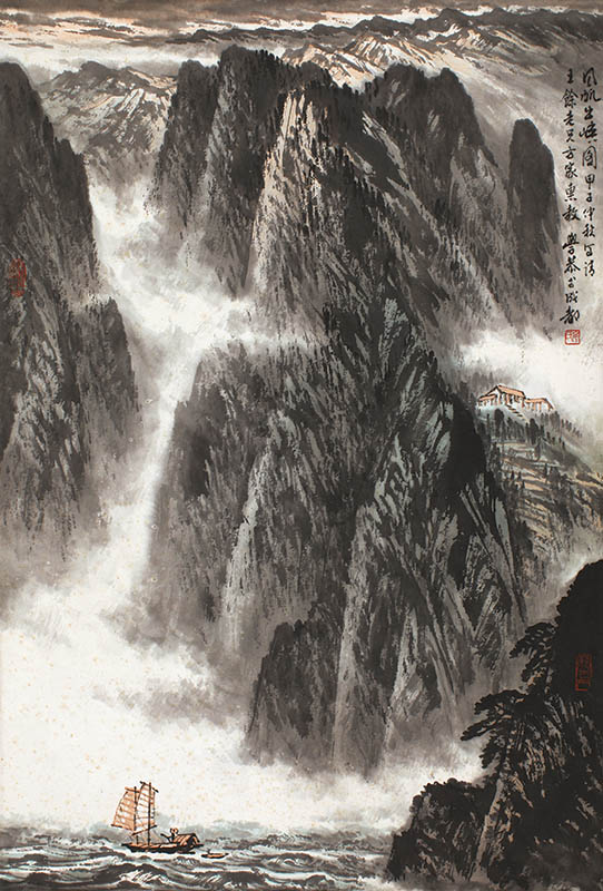 款识:风帆出峡图。甲子仲秋写请王余老兄方家惠教,学恭于成都。
