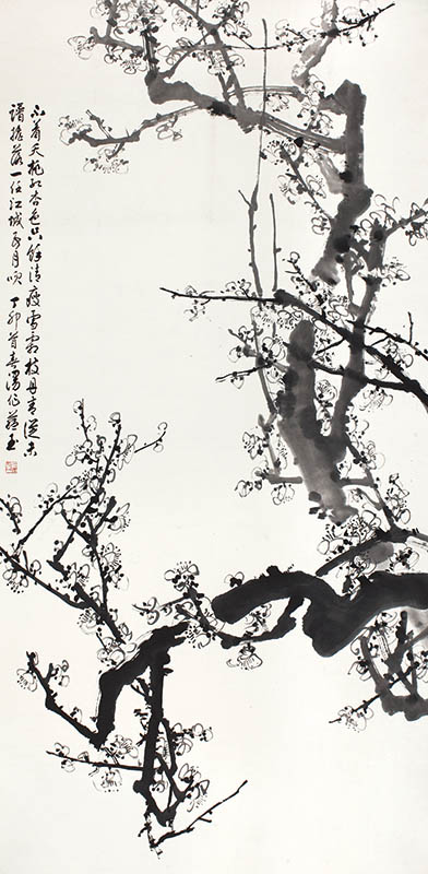 款识:不着夭桃红杏色,只余清瘦雪霜枝。丹青从未谱摇落,一任江城五月吹。丁卯首春漫作,蕴玉。