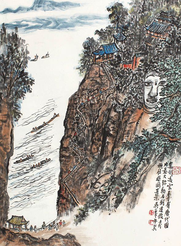 款识:嘉州凌云寺有唐代国内最大弥勒石刻造像。壬戌秋往游图其景,吴一峰年七十六。